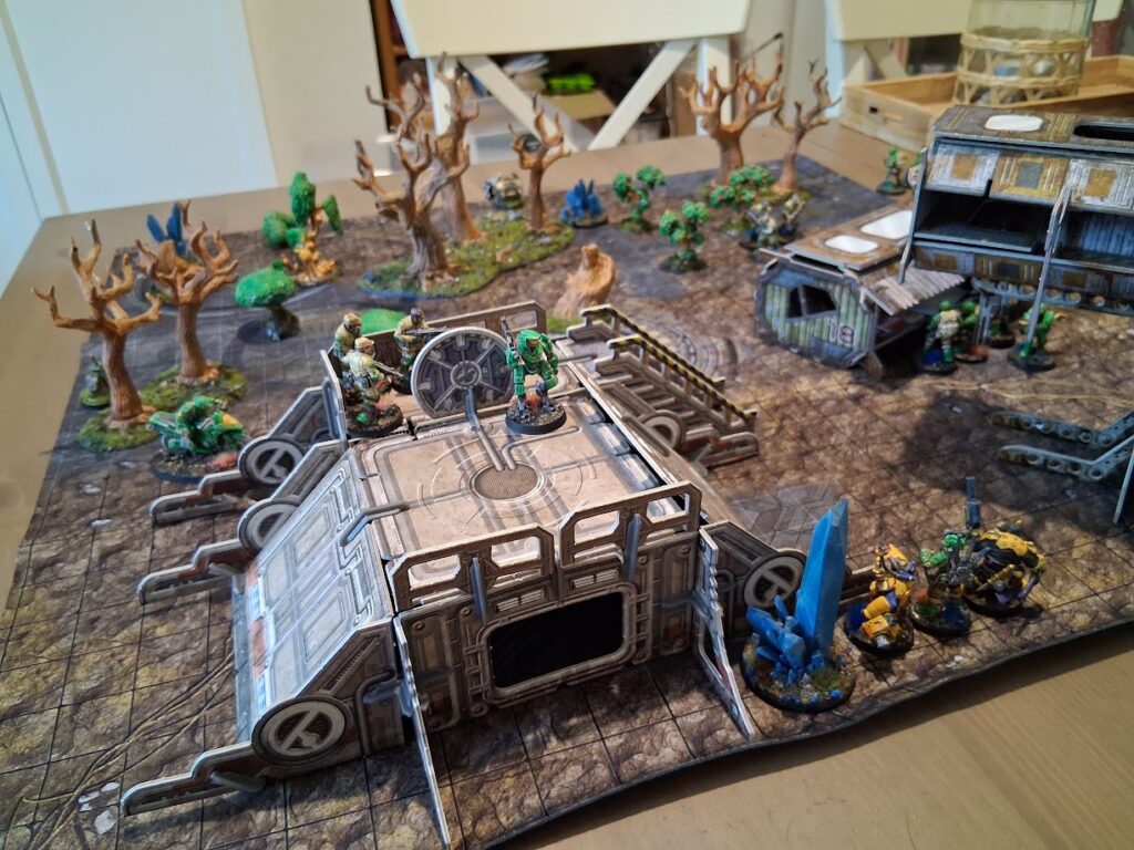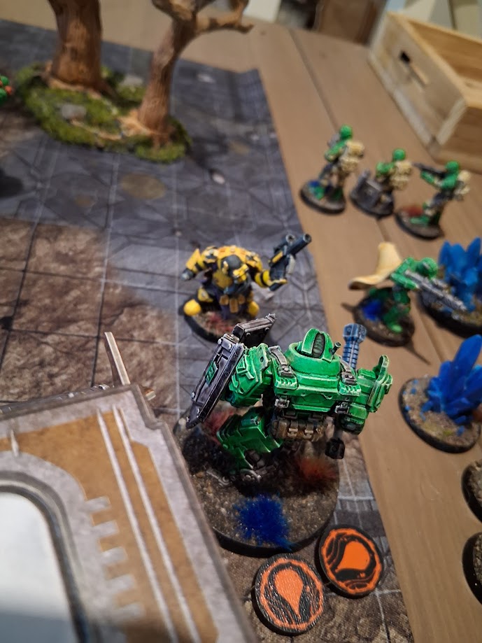 Das Schwierige Gelände senkt sich um den Professor, der nur langsam vorankriecht und nicht mehr in Reichweite kommen kann, um gegen den OGRE zu helfen … aber sich immerhin die letzte Wunde heilt.Die Entladungen des Generators treffen nun automatisch alle im Umfeld, aber weder unsere Helden noch der OGRE erleiden eine Wunde. Dunkold schlägt dem Generator den letzten Marker herunter und eigentlich wäre damit das primäre Missionsziel erfüllt … wenn alle Helden in der Nähe wären, aber der Professor fehlt noch. Dunkold schießt auf den OGRE, kann ihm trotz fehlendem Panzerdurchschlag zwei Wunden schießen. Damit fällt der Roboter auf weniger als die Hälfte seines Zäh-Wertes und verkackt nicht nur seinen Moralwurf, sondern auch noch seinen Roboter-Rettungswurf für Moraltests! Der OGRE steht nun angeschlagen vor den Helden! Der Leise Hugo hat da keine Skrupel und schießt zweimal auf den Roboter, kann ihm aber nur noch eine weitere Wunde verursachen.